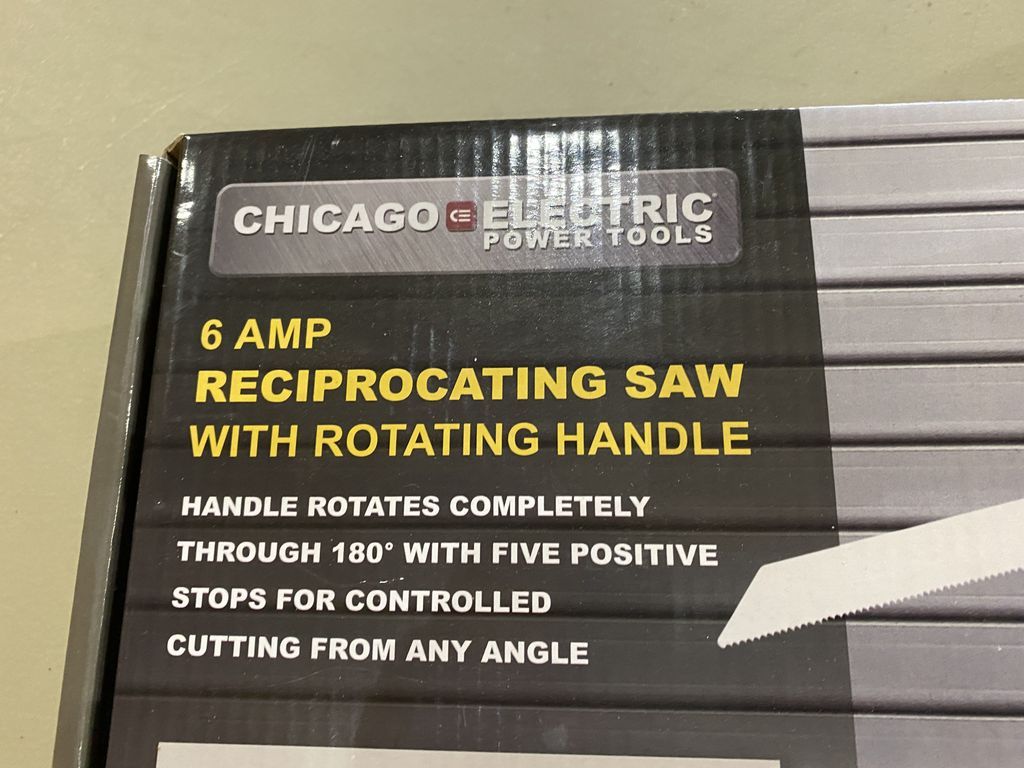 Chicago Electric 6 Amp Reciprocating Saw, in box. Location Metal Shelves Chicago Electric 6 Amp Reciprocating Saw, in box. Location Metal Shelves