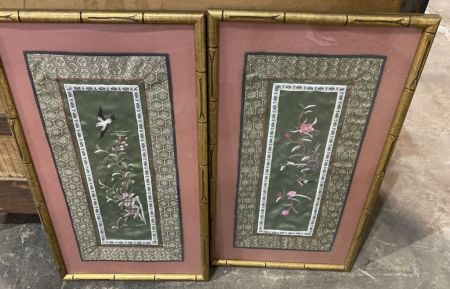Two Framed Asian Style Silks, matted, bamboo style framed. 13.5" x 24" Two Framed Asian Style Silks, matted, bamboo style framed. 13.5" x 24"