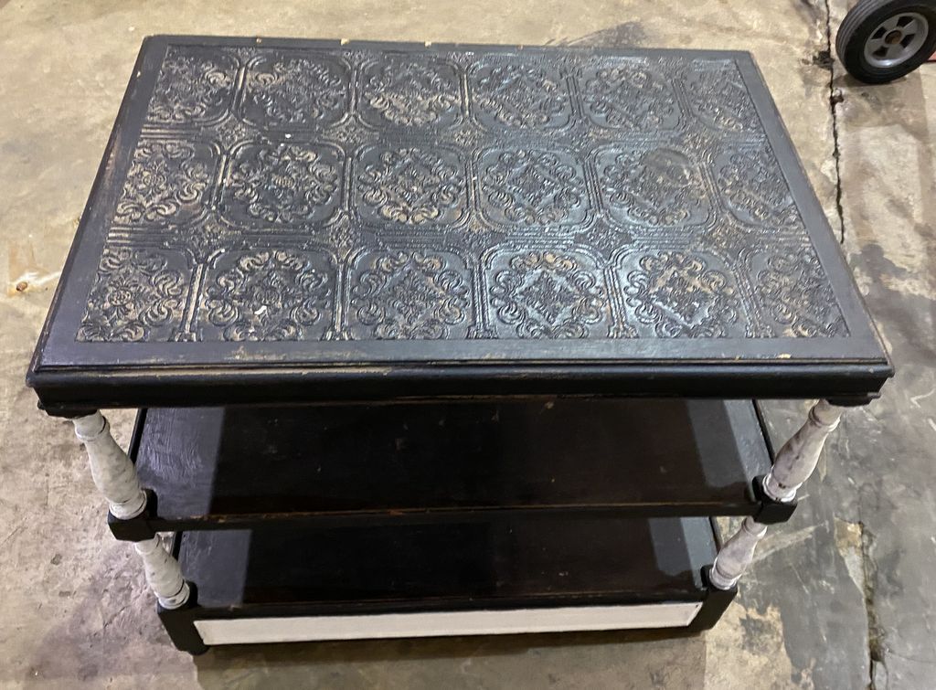 Modern Painted Lamp Table, three tier, has wear. 25" w 17" d 22" h Row 6 Modern Painted Lamp Table, three tier, has wear. 25" w 17" d 22" h Row 6