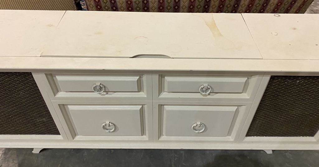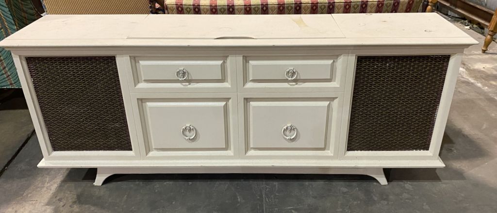 Curtis Mathis Late 20th Century Radio Cabinet, painted white. Untested. 72" w 17" d 29" h. Row 5 Curtis Mathis Late 20th Century Radio Cabinet, painted white. Untested. 72" w 17" d 29" h. Row 5