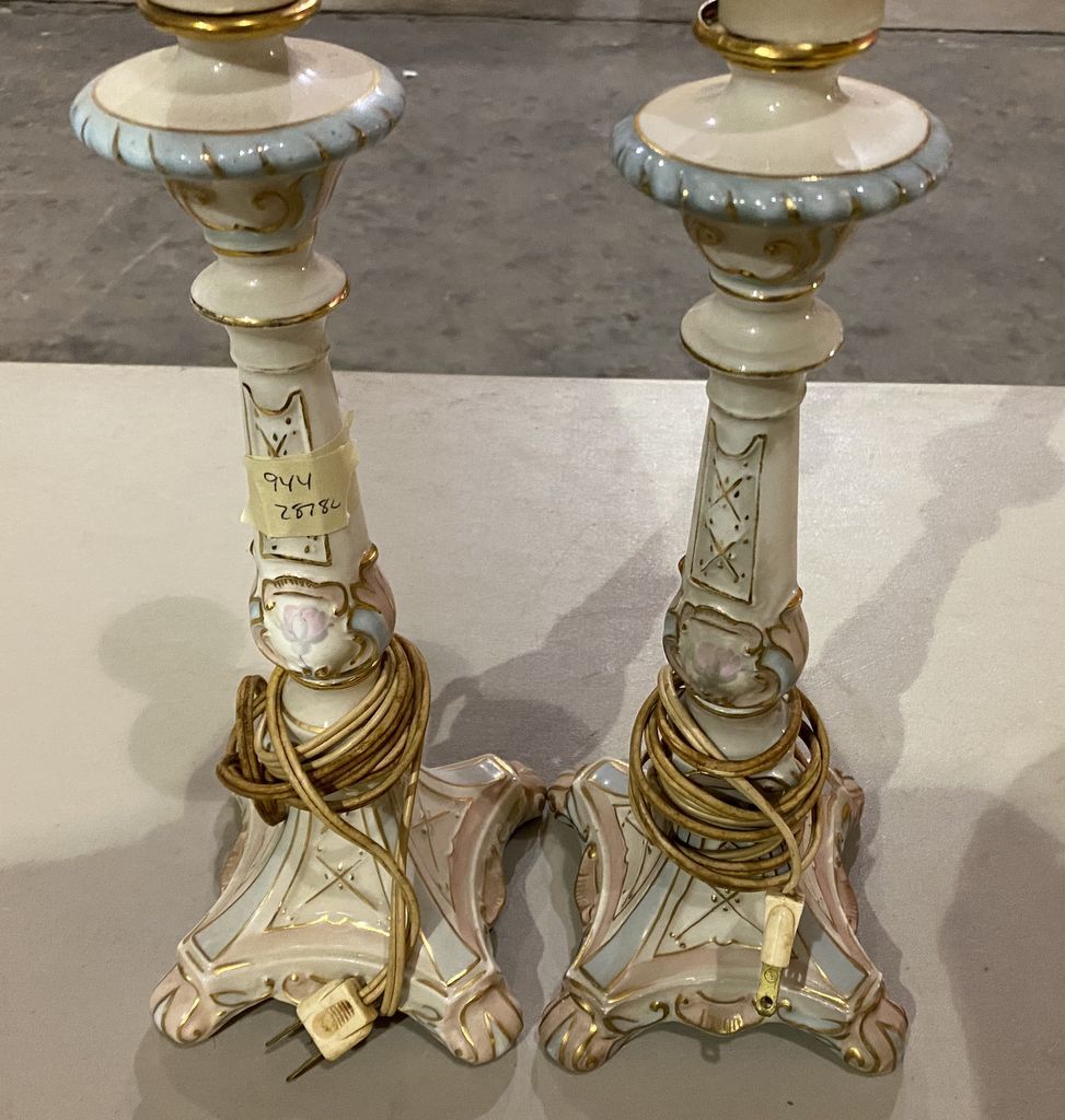 Pair of Porcelain Candle Stick Lamps, hand painted, 20"h. Pair of Porcelain Candle Stick Lamps, hand painted, 20"h.