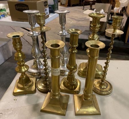 Group of Brass Candle Holders, Location Metal Shelves Group of Brass Candle Holders, Location Metal Shelves