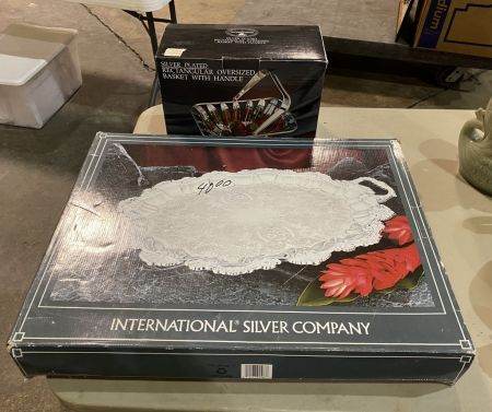 International Silver Plate Tray and Paul Revere Basket with Handle, Location Metal Shelves International Silver Plate Tray and Paul Revere Basket with Handle, Location Metal Shelves