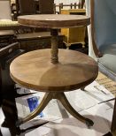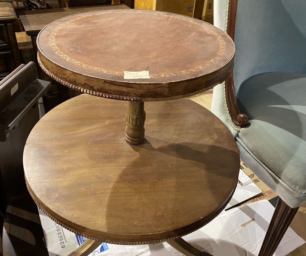 Vintage Parlor Dumbwaiter, two tier, metal paw footed on casters, leather top, finish is worn, 29"h., 21"w. Row 12 Vintage Parlor Dumbwaiter, two tier, metal paw footed on casters, leather top, finish is worn, 29"h., 21"w. Row 12