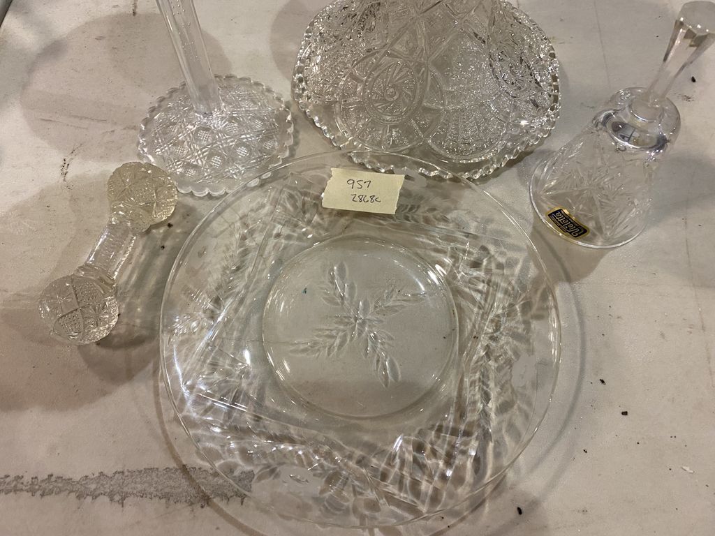 Group of Vintage Glass Compote, Punch Bowl Stand, Knife Rest, Bell, and Plate, Compote is cracked, Location Metal Shelves Group of Vintage Glass Compote, Punch Bowl Stand, Knife Rest, Bell, and Plate, Compote is cracked, Location Metal Shelves