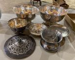 Group of Silver Plate Serving Pieces, bowls. Location Metal Shelves Group of Silver Plate Serving Pieces, bowls. Location Metal Shelves