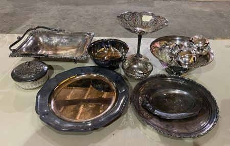 Group of Serving Silver Plate, compote, trays, plates, bells, and etc. Location Metal Shelves Group of Serving Silver Plate, compote, trays, plates, bells, and etc. Location Metal Shelves