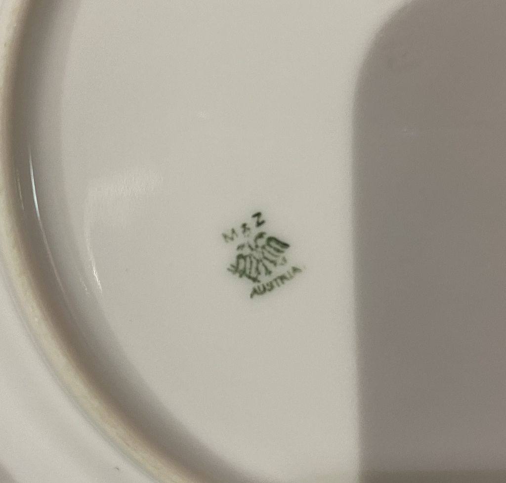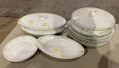 MZ Austria Porcelain Tureens, Plates, and Platter, Location Metal Shelves MZ Austria Porcelain Tureens, Plates, and Platter, Location Metal Shelves