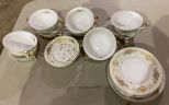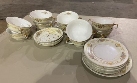 Noritake Porcelain Soup CuLocation Metal Shelvesps and Plates, one has chip, Noritake Porcelain Soup CuLocation Metal Shelvesps and Plates, one has chip,