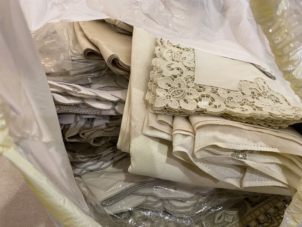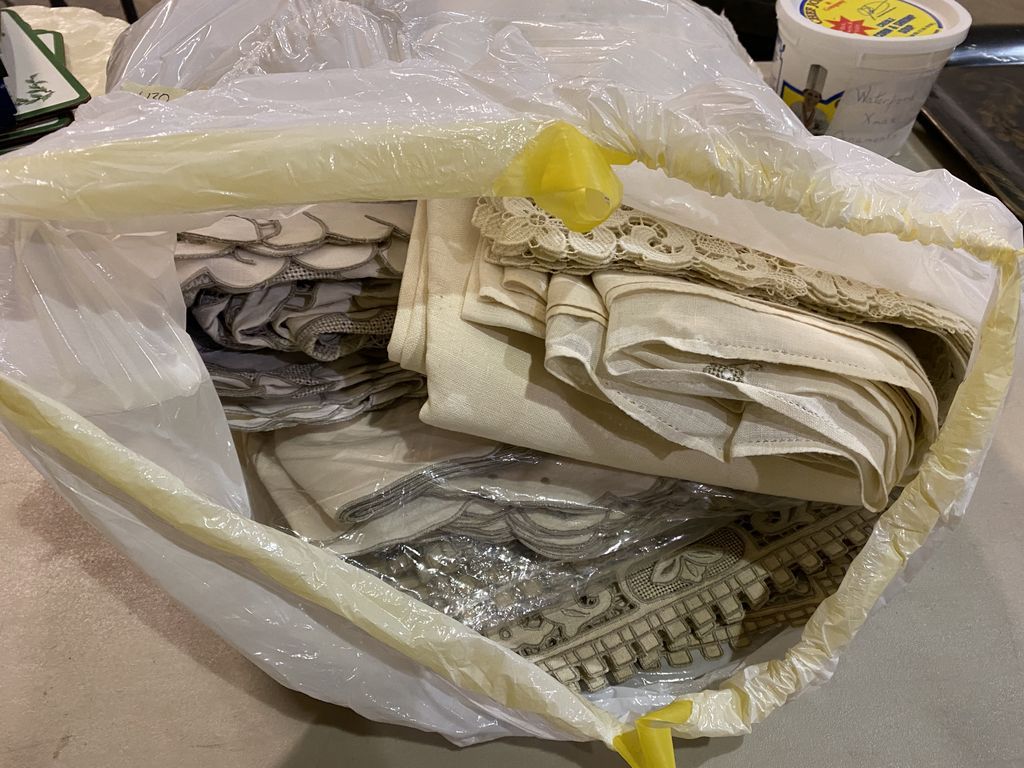 Bag of Tables Linens, assorted styles. Location Metal Shelves Bag of Tables Linens, assorted styles. Location Metal Shelves