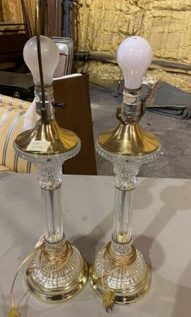 Glass and Brass Candle Stick Lamps, 27"h. Location Metal Shelves Glass and Brass Candle Stick Lamps, 27"h. Location Metal Shelves