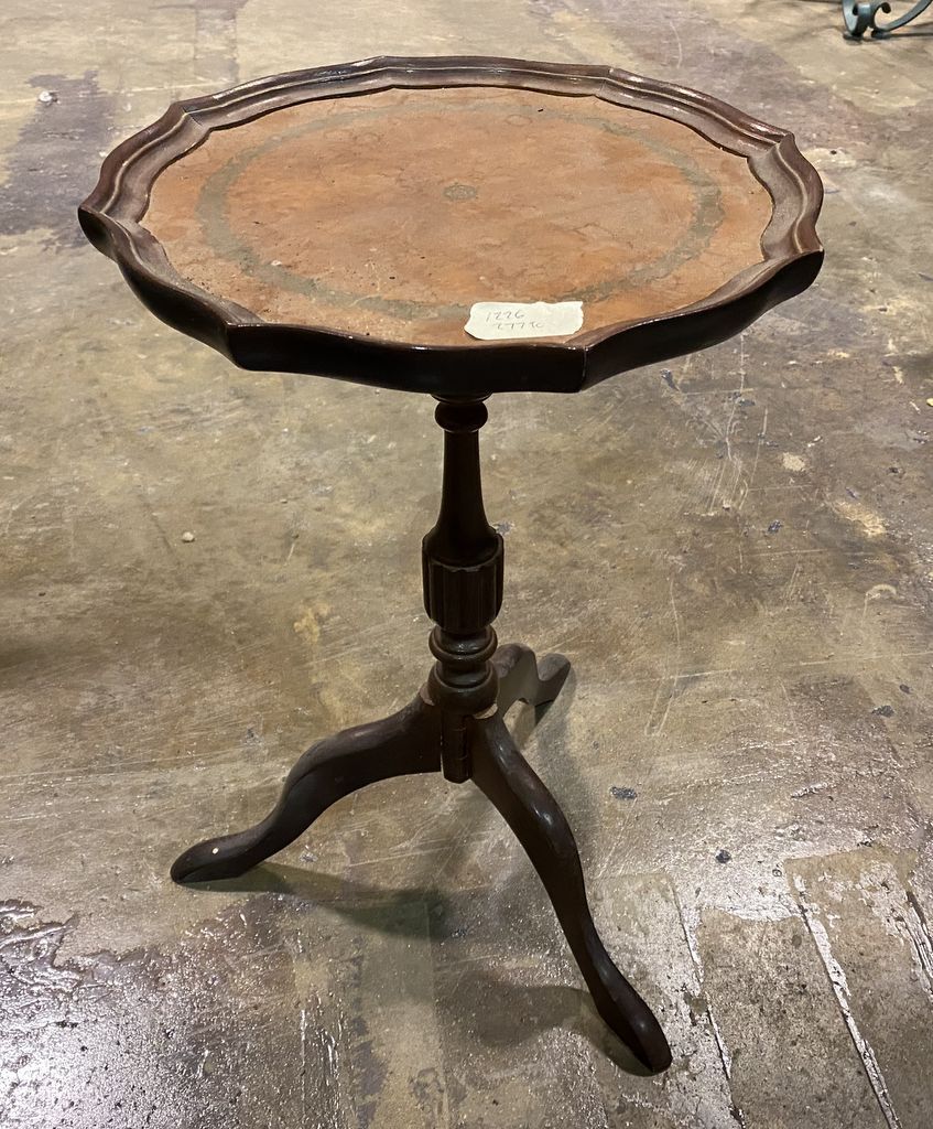 Small Vintage Mahogany Pedestal Table, worn leather top, 20"h. 13"w. Row 6 Small Vintage Mahogany Pedestal Table, worn leather top, 20"h. 13"w. Row 6