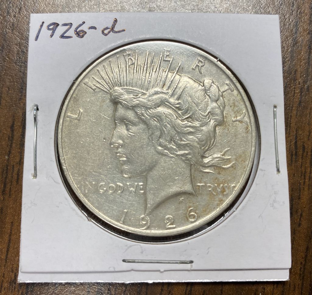 `1926 D Peace Liberty Dollar, paper case, Location Office `1926 D Peace Liberty Dollar, paper case, Location Office