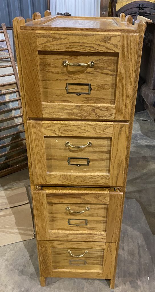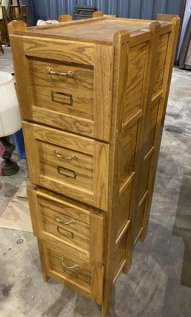 Four Oak Stackable Style File Cabinet, brass pulls. light wear. 53"h., 16"w. one piece, Location Back Left Side Four Oak Stackable Style File Cabinet, brass pulls. light wear. 53"h., 16"w. one piece, Location Back Left Side