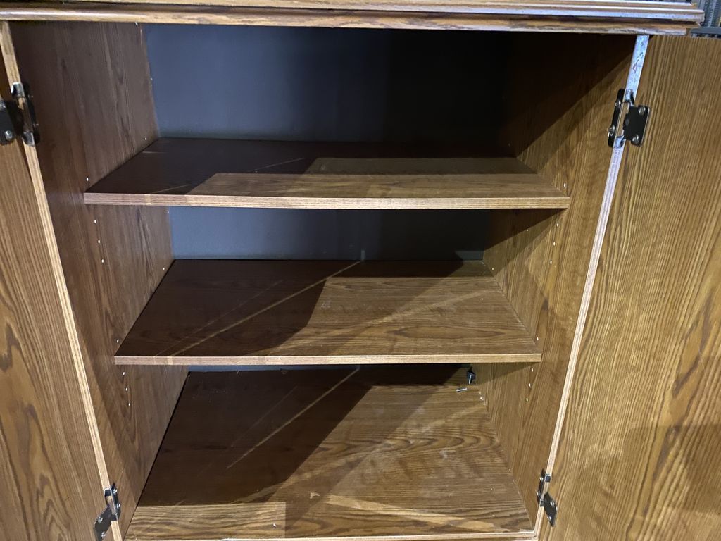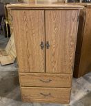 Pressed Wood Oak Kit Armoire, needs tightening. 55"h., 30"w. Location Back Left Side Pressed Wood Oak Kit Armoire, needs tightening. 55"h., 30"w. Location Back Left Side