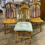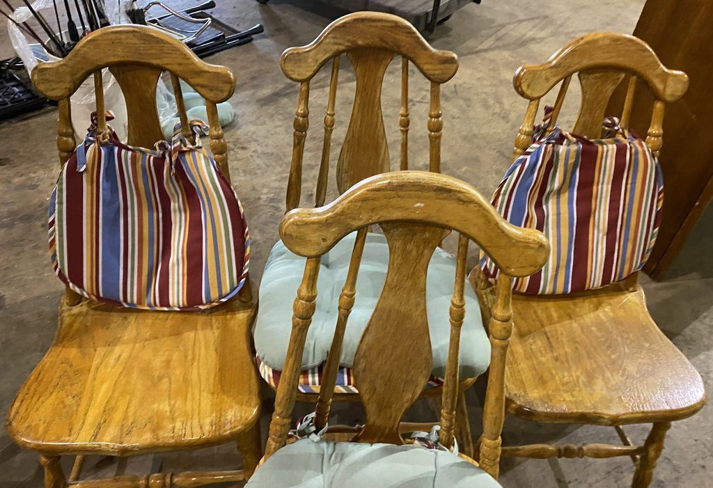 1970's Oak Farm House Style Dining Chairs, four total. Location Back Left Side 1970's Oak Farm House Style Dining Chairs, four total. Location Back Left Side