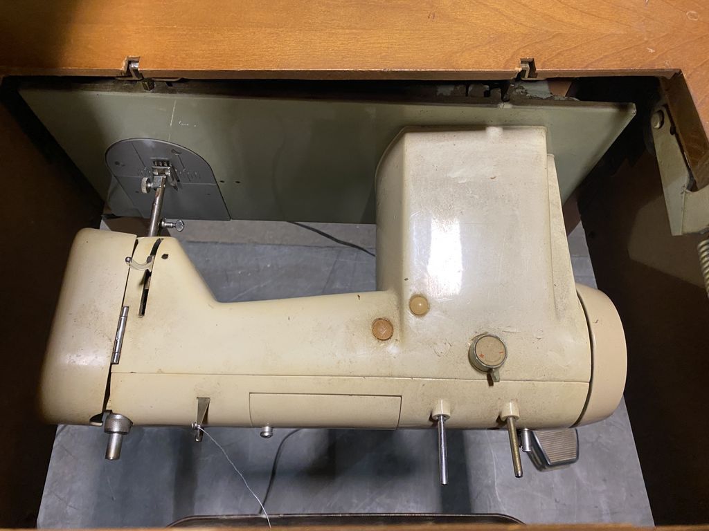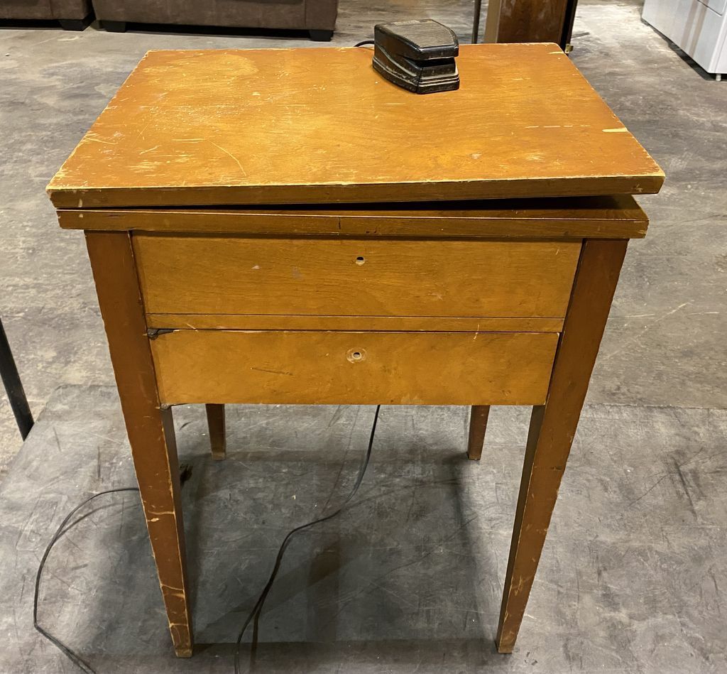 Vintage Maple Sewing Machine, has machine and pedal, finish wear. 21"h., 23"w. Location Back Left Side Vintage Maple Sewing Machine, has machine and pedal, finish wear. 21"h., 23"w. Location Back Left Side
