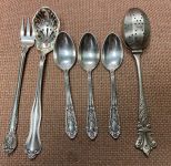 3 Demitasse spoons, cocktail fork, two serving spoon. Location Office 3 Demitasse spoons, cocktail fork, two serving spoon. Location Office
