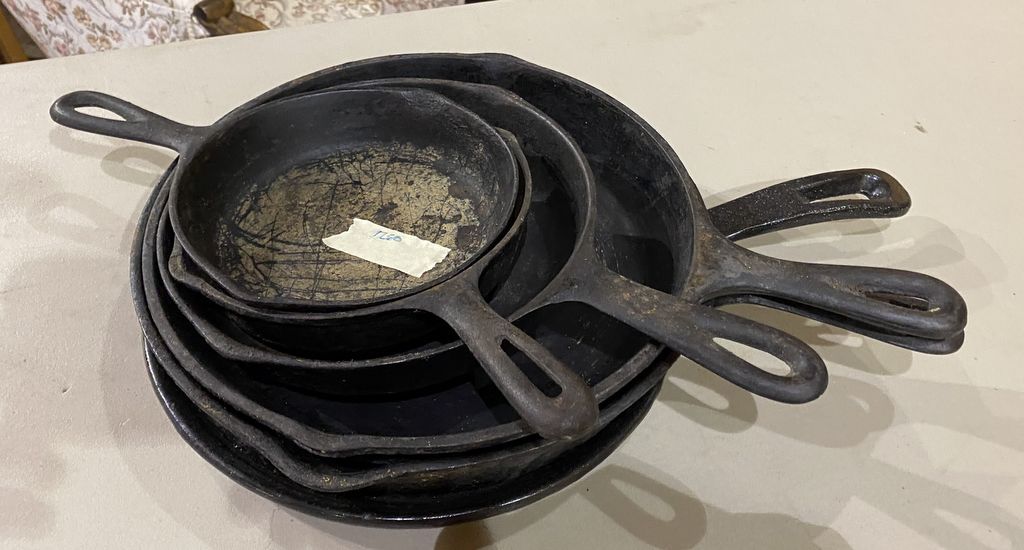 Group of Old Cast Iron Skillets, Location Metal Shelves Group of Old Cast Iron Skillets, Location Metal Shelves