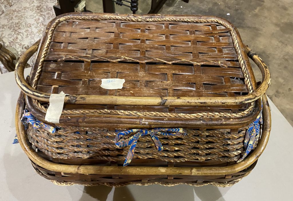 Large Decorative Picnic Backet, weaved wood, light wear, 19"w. Location Metal Shelves Large Decorative Picnic Backet, weaved wood, light wear, 19"w. Location Metal Shelves