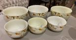 Hall's Pottery Mixing bowls, one has hairline crack, 5"h., 9"dia. Location Metal Shelves Hall's Pottery Mixing bowls, one has hairline crack, 5"h., 9"dia. Location Metal Shelves