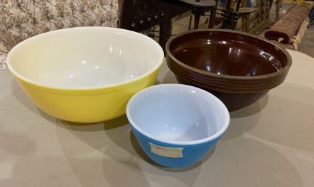 1272 Large Pyrex Mixing Bowl, Small Pyrex Bowl, and Stoneware Pottery Bowl