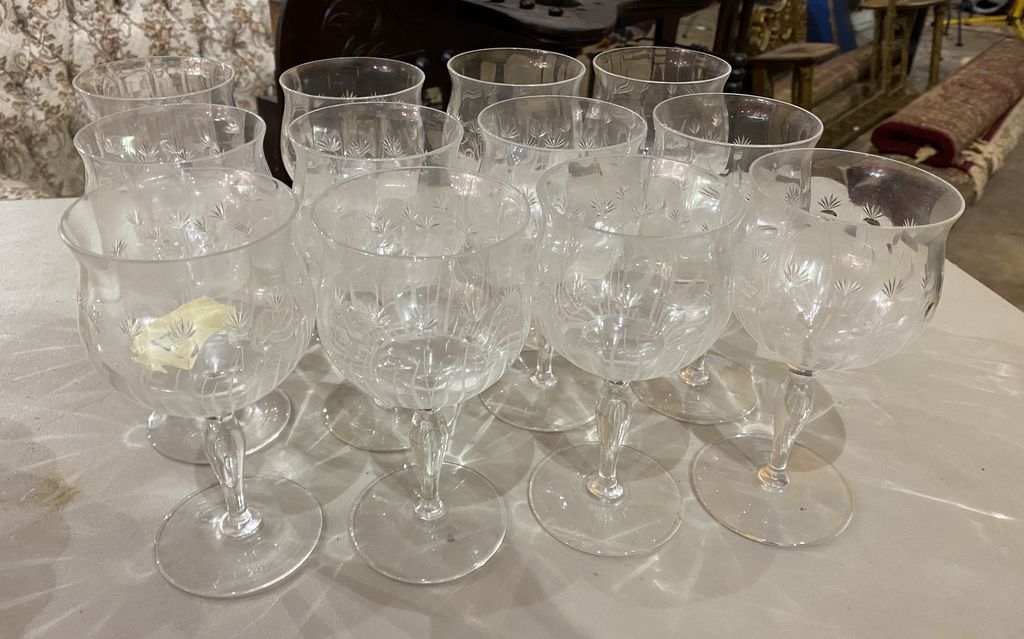 12 Crystal Wine Stem Glasses, Location Metal Shelves 12 Crystal Wine Stem Glasses, Location Metal Shelves