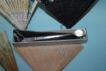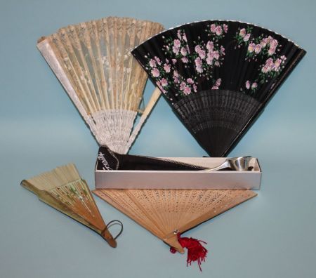 Four Fans and Silver Candle Snuffer, one all wood pierced carved fan 14" dia. One black hand-painted - 15" dia., one green hand painted on wood - 15 1/2" dia. One white lace 18" dia. Along with 10" Silverplate helmet snuffer by Gerity Four Fans and Silver Candle Snuffer, one all wood pierced carved fan 14" dia. One black hand-painted - 15" dia., one green hand painted on wood - 15 1/2" dia. One white lace 18" dia. Along with 10" Silverplate helmet snuffer by Gerity