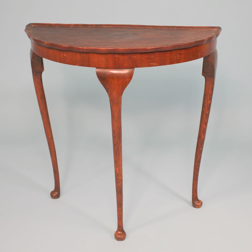 Demi-lune Mahogany Side Table, supported by three tapered Queen Anne legs and skirted top, 29" h. x 29' w. Demi-lune Mahogany Side Table, supported by three tapered Queen Anne legs and skirted top, 29" h. x 29' w.