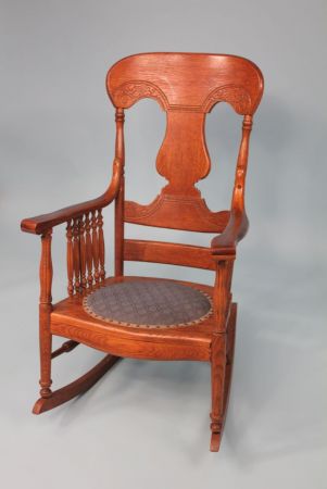 Circa 1900 Heavy Oak Rocker, pressed back, spindled arms and cane seat, now covered by fabric, 41" h. x 23" w. Circa 1900 Heavy Oak Rocker, pressed back, spindled arms and cane seat, now covered by fabric, 41" h. x 23" w.