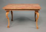 French Marble Top Table, base made of heavy iron and French design shaped legs, top made of light brown marble, 16" h. x 27" w. French Marble Top Table, base made of heavy iron and French design shaped legs, top made of light brown marble, 16" h. x 27" w.