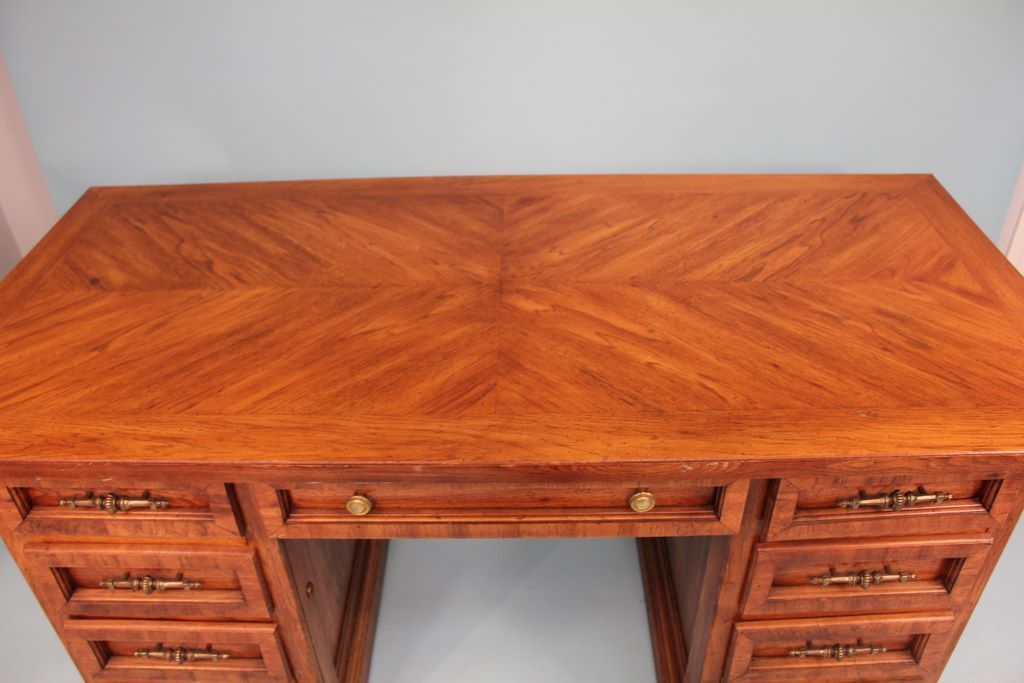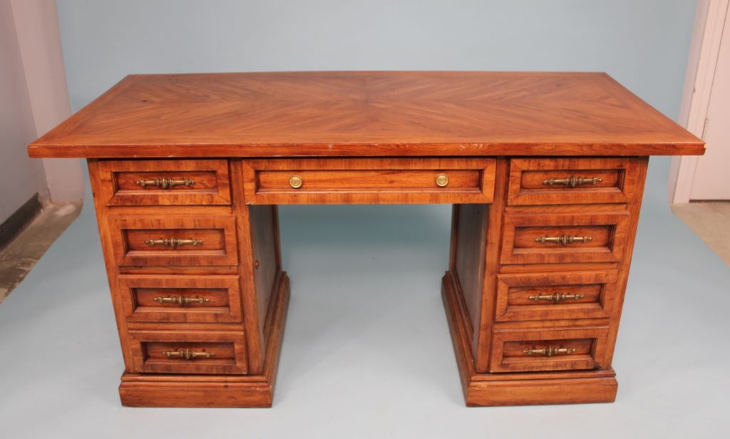 Nine Drawer Knee Hole Desk, with designed top in burl mahogany, 30 1/2" h. x 62" l. x 29" D. Nine Drawer Knee Hole Desk, with designed top in burl mahogany, 30 1/2" h. x 62" l. x 29" D.