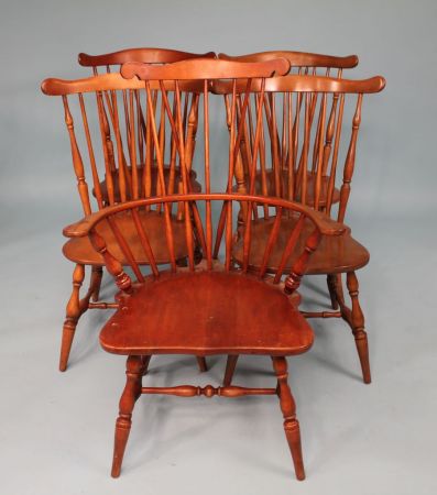 Set of Five Maple Spindle Back Vintage Chairs, one arm, four sides 36" h. Set of Five Maple Spindle Back Vintage Chairs, one arm, four sides 36" h.