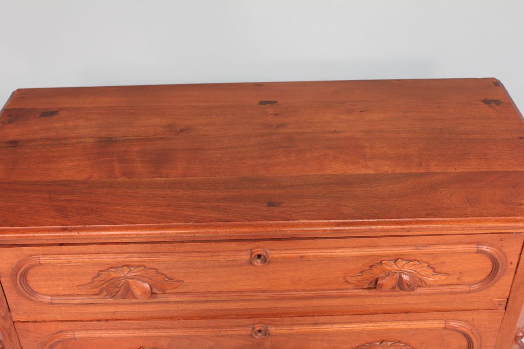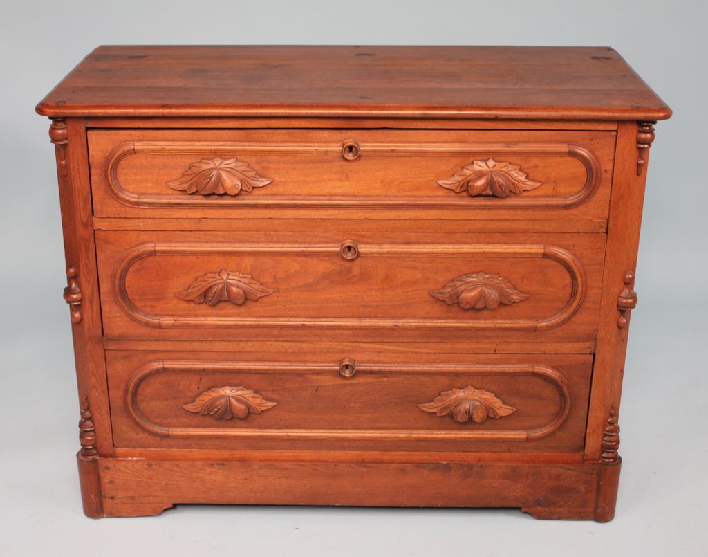 Walnut Three Drawer Chest of Drawers, each drawer having Acorn and Leaf pulls, curved trim and keyhole. 31"h x 40 1/2"w. Walnut Three Drawer Chest of Drawers, each drawer having Acorn and Leaf pulls, curved trim and keyhole. 31"h x 40 1/2"w.