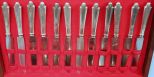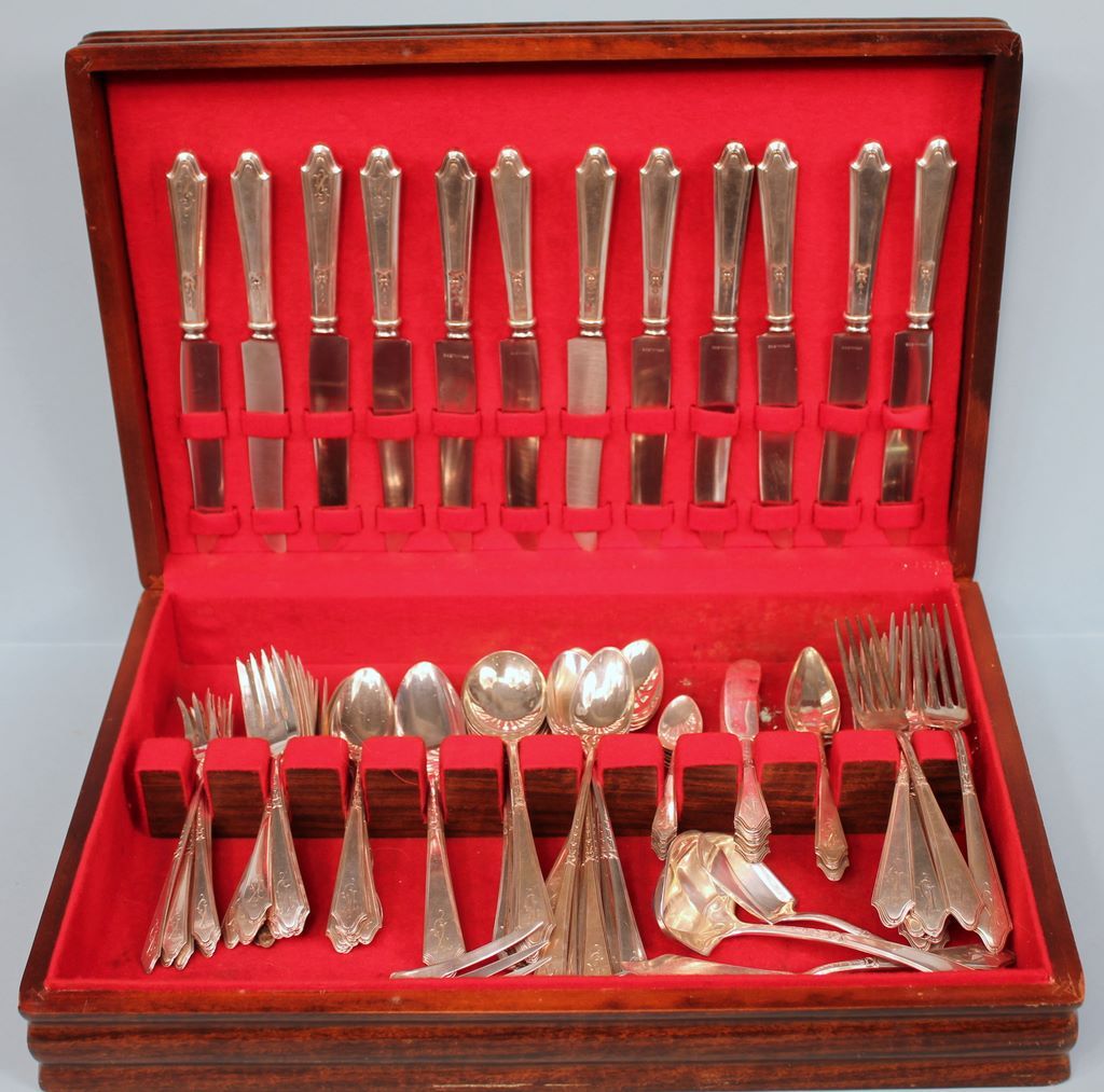 Ninety-eight Pieces of Lunt Treasure Sterling Silver Flatware, Chateau Thierry Pattern, set consisting of 12 dinner forks, 3 fruit spoons, 8 butter knives, 6 Demi-Tesse spoons, 12 ice teaspoons, 12 soup spoons, 9 teaspoons, 11 salad forks, 8 cocktail forks, 12 knives, 1 sugar spoon, 1 master butter, 1 gravy ladle, 1 cold meat fork, 1 olive spoon, monogrammed "K" on handles. Ninety-eight Pieces of Lunt Treasure Sterling Silver Flatware, Chateau Thierry Pattern, set consisting of 12 dinner forks, 3 fruit spoons, 8 butter knives, 6 Demi-Tesse spoons, 12 ice teaspoons, 12 soup spoons, 9 teaspoons, 11 salad forks, 8 cocktail forks, 12 knives, 1 sugar spoon, 1 master butter, 1 gravy ladle, 1 cold meat fork, 1 olive spoon, monogrammed "K" on handles.