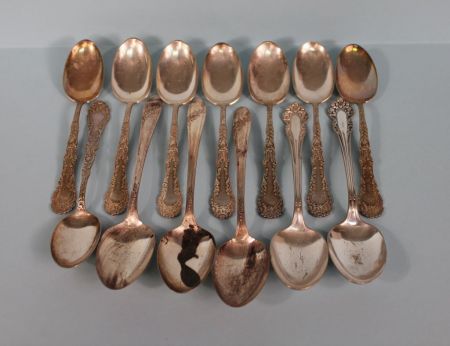 Thirteen Silverplate Serving Spoons, two community Silverplate serving spoons, Avalon pattern 7 1/2" long, three Oneida Tudor Plate Queen Bess II Pattern serving spoons 8' long and eight Rogers serving spoons, 7" long Thirteen Silverplate Serving Spoons, two community Silverplate serving spoons, Avalon pattern 7 1/2" long, three Oneida Tudor Plate Queen Bess II Pattern serving spoons 8' long and eight Rogers serving spoons, 7" long