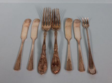 Lot of Silverplate; set of four Vernon Silverplate butter knives 6" long, one Rogers Silverplate cocktail fork, two W.M. Rogers dinner forks Lot of Silverplate; set of four Vernon Silverplate butter knives 6" long, one Rogers Silverplate cocktail fork, two W.M. Rogers dinner forks