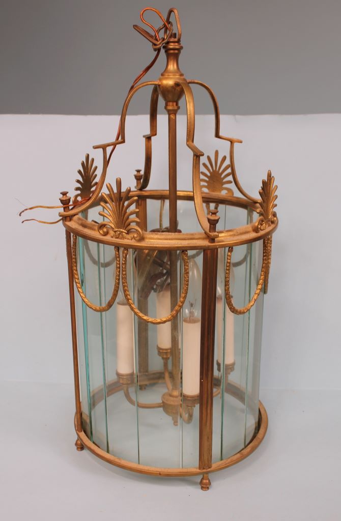 Vintage Brass and Beveled Glass Hall Fixture with four electrified candles, ornate brass swags and finials, 10 1/2" dia., 20 1/2" h. Vintage Brass and Beveled Glass Hall Fixture with four electrified candles, ornate brass swags and finials, 10 1/2" dia., 20 1/2" h.