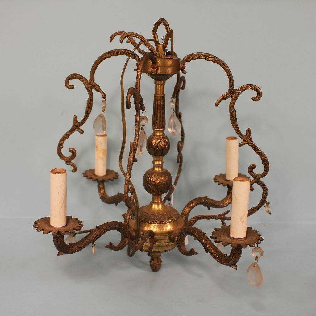 Vintage brass hall fixture with glass tear drops. One bracket needs welding. 15 1/2" h., 14 1/2" dia. Vintage brass hall fixture with glass tear drops. One bracket needs welding. 15 1/2" h., 14 1/2" dia.
