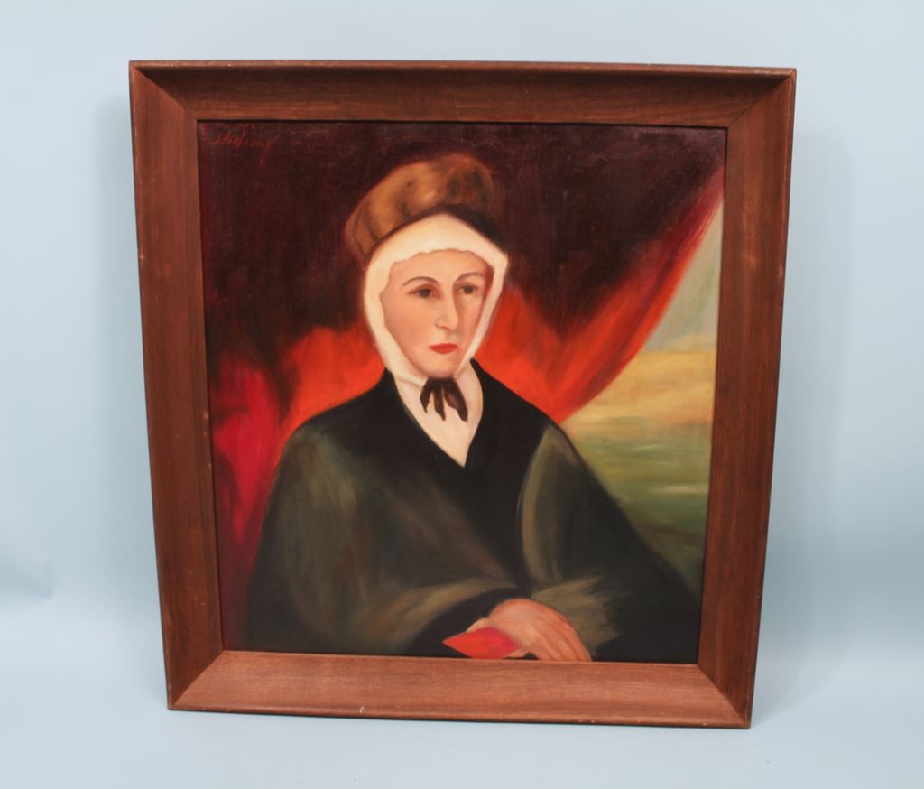 Oil on Canvas Painting of Quaker Woman, artist signed Vera L. Stephenson (Jackson, MS); painted in the late 1960's early 1970's, framed in a simple wood frame, 28" h., 30" w. Oil on Canvas Painting of Quaker Woman, artist signed Vera L. Stephenson (Jackson, MS); painted in the late 1960's early 1970's, framed in a simple wood frame, 28" h., 30" w.