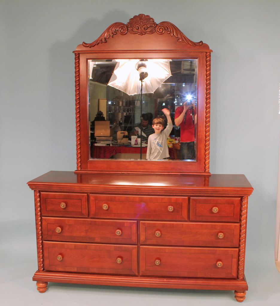 Fine French Chest of Drawers, base with one smaller drawer over four even drawers, and with cross banding and fine veneers, large beveled mirror over the base. 65 1/2" w., 88" h., 19" d. Fine French Chest of Drawers, base with one smaller drawer over four even drawers, and with cross banding and fine veneers, large beveled mirror over the base. 65 1/2" w., 88" h., 19" d.