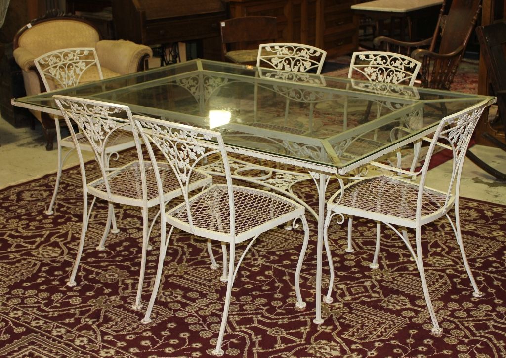 Glass Top Iron Table with Six Chairs, all containing iron scroll designs. 28"h, 49"w, 68"l. Glass Top Iron Table with Six Chairs, all containing iron scroll designs. 28"h, 49"w, 68"l.