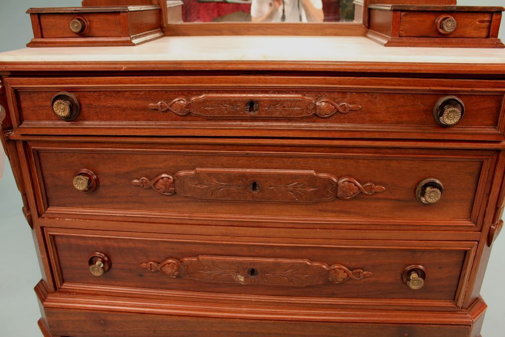 Mid 19th Century Walnut Victorian Marble Top Dresser; with inset marble top, two glove boxes and two candle brackets. Three graduated drawers with interior of top drawer divided. Carved mirror top. 87"h x 49"w Mid 19th Century Walnut Victorian Marble Top Dresser; with inset marble top, two glove boxes and two candle brackets. Three graduated drawers with interior of top drawer divided. Carved mirror top. 87"h x 49"w
