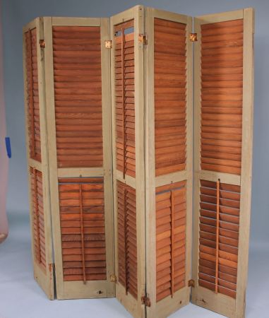 Five Plantation Style Shutters, painted greed and natural wood. Three hinged as one and two hinged together (one missing slat) each 17" w., 80" h. Five Plantation Style Shutters, painted greed and natural wood. Three hinged as one and two hinged together (one missing slat) each 17" w., 80" h.