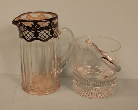 Early 1900's silver overlay pitcher, art nouveau design, divided glass panels, 6 1/2" h.; contemporary ice bucket with chrome handle, 4 1/2" h., 4" dia. Early 1900's silver overlay pitcher, art nouveau design, divided glass panels, 6 1/2" h.; contemporary ice bucket with chrome handle, 4 1/2" h., 4" dia.