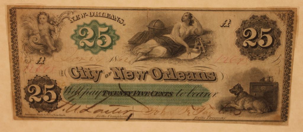 City of New Orleans Twenty-five Cent Certificate, dated 1862, Printed by American Bank Note Co. New York 6"l. x 2 1/2"h. City of New Orleans Twenty-five Cent Certificate, dated 1862, Printed by American Bank Note Co. New York 6"l. x 2 1/2"h.
