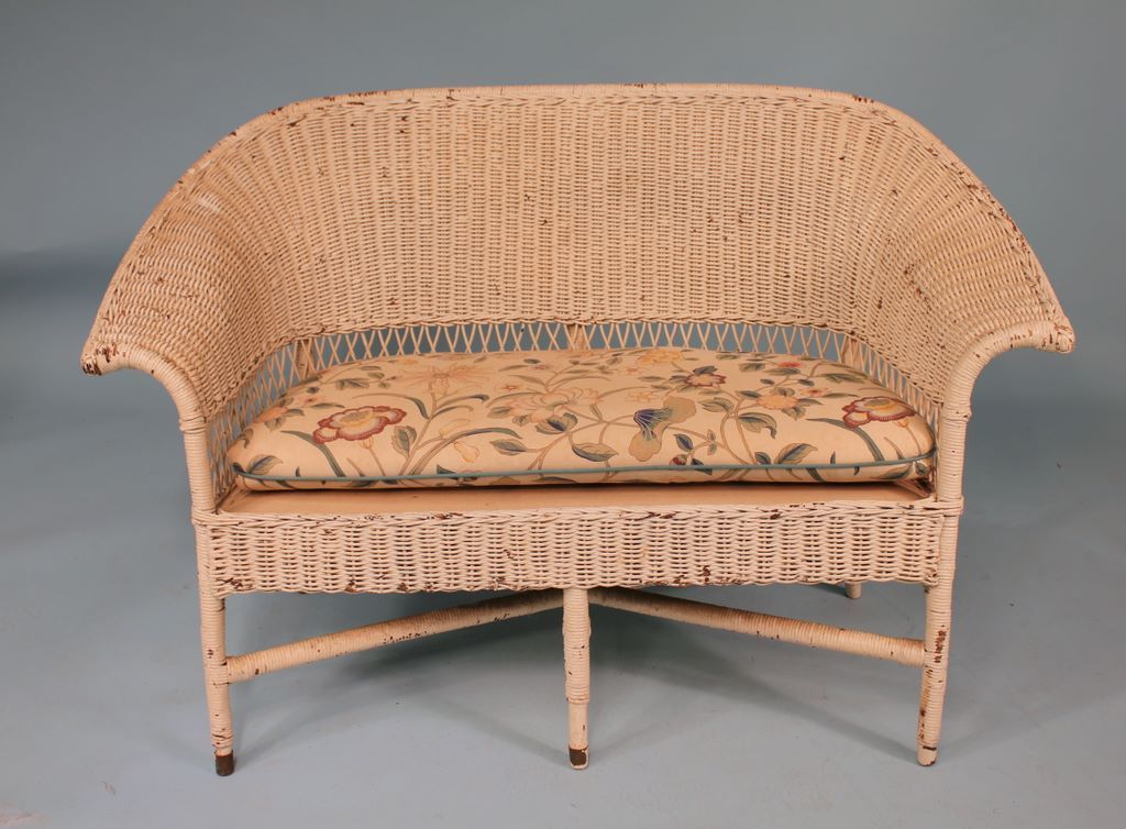 Small Wicker Settee, single cushion, paint flaking, 50" w., 17" d., 32" h. Small Wicker Settee, single cushion, paint flaking, 50" w., 17" d., 32" h.