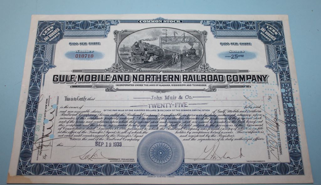 1933 Gulf, Mobile and Northern Railroad Company Bond (25 Shares) John Muir and Company (Common Stock) 1933 Gulf, Mobile and Northern Railroad Company Bond (25 Shares) John Muir and Company (Common Stock)