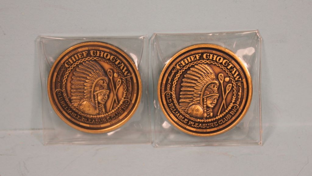 New Orleans New Doubloon Coins. Interesting lot of Choctaw Doubloons which includes 1963 Krewe of Choctaw. Choctaw Chief in full headdress, obverse has a covered wagon and reads "Old Reliable Pleasure Club, Inc." 1935. approximately 90 Choctaw doubloons. Also some Heavies in Cleopatra. approximately 85 of these various doubloons. New Orleans New Doubloon Coins. Interesting lot of Choctaw Doubloons which includes 1963 Krewe of Choctaw. Choctaw Chief in full headdress, obverse has a covered wagon and reads "Old Reliable Pleasure Club, Inc." 1935. approximately 90 Choctaw doubloons. Also some Heavies in Cleopatra. approximately 85 of these various doubloons.