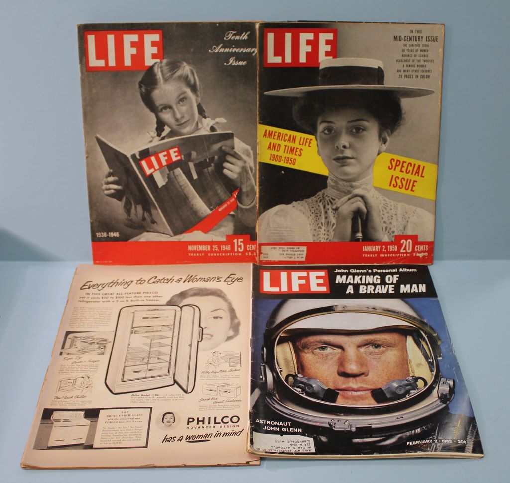 Box lot of 18 Vintage Life Magazines. Includes July 3, 1950 - The American Revolution, January 2, 1950 - Special Issue, November 25, 1946 - Tenth Anniversary Issue, Several on Scott Carpenter, May 11, 1962 - Bob Hope at his career, February 2, 1962 - John Glenn and others. Box lot of 18 Vintage Life Magazines. Includes July 3, 1950 - The American Revolution, January 2, 1950 - Special Issue, November 25, 1946 - Tenth Anniversary Issue, Several on Scott Carpenter, May 11, 1962 - Bob Hope at his career, February 2, 1962 - John Glenn and others.